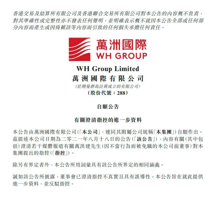 此前的8月18日,万洲国际已发布公告,澄清万洪建的指控存在不真实性和误导性,强调公司保留向万洪建先生/或对指控需负责的人士采取法律行动的权利。