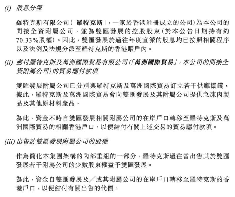万洲国际回应:本公司于2006年3月2日在开曼群岛注册成立。主要在中国和美国及欧洲若干选定市场进行世界上最大的猪肉业务,包括猪肉及肉制品的生产与销售。除一般经营业务及投资需要外,本公司并无将资金从双汇发展转移至境外市场。在股息分派、贸易应付款项结算及出售双汇发展附属公司的股权方面,公司均按照相关程序以及法例及法规进行结付、分派。