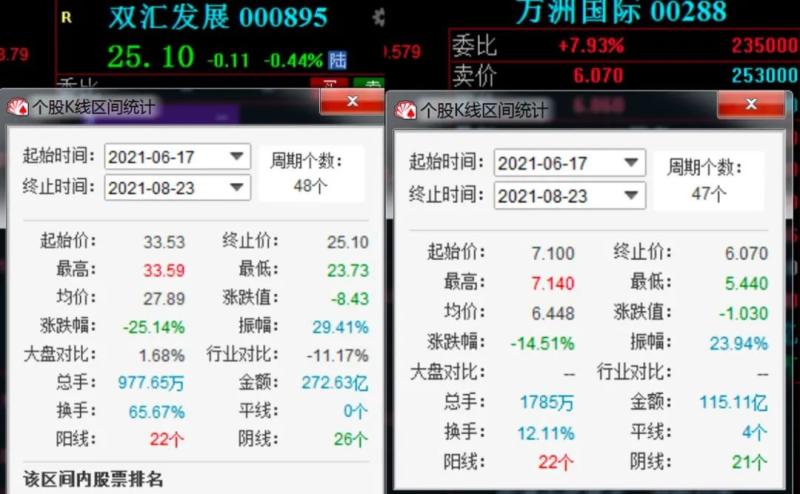 截至8月23日收盘,双汇发展股价期间累计下跌25.14%,股价几乎降到了今年最低点。万洲国际股价累计下跌14%左右。