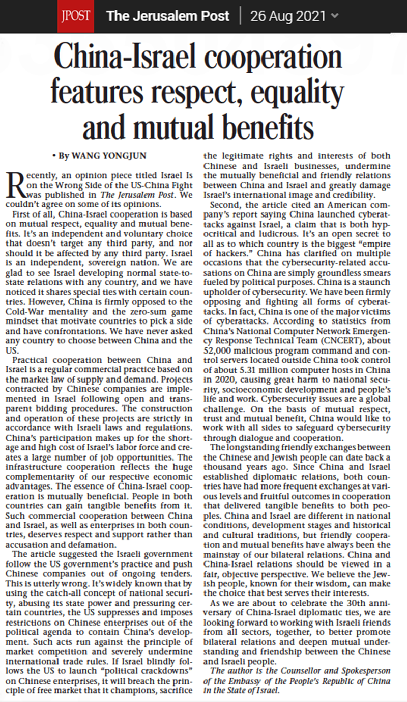 据中国驻以色列使馆网站消息,2021年8月26日,中国驻以色列使馆新闻发言人在以色列发行量最大的英文报纸《耶路撒冷邮报》发表题为《相互尊重、平等互利是中以合作的基础》的评论文章,驳斥该报有关涉华错误言论,澄清事实真相。全文如下: