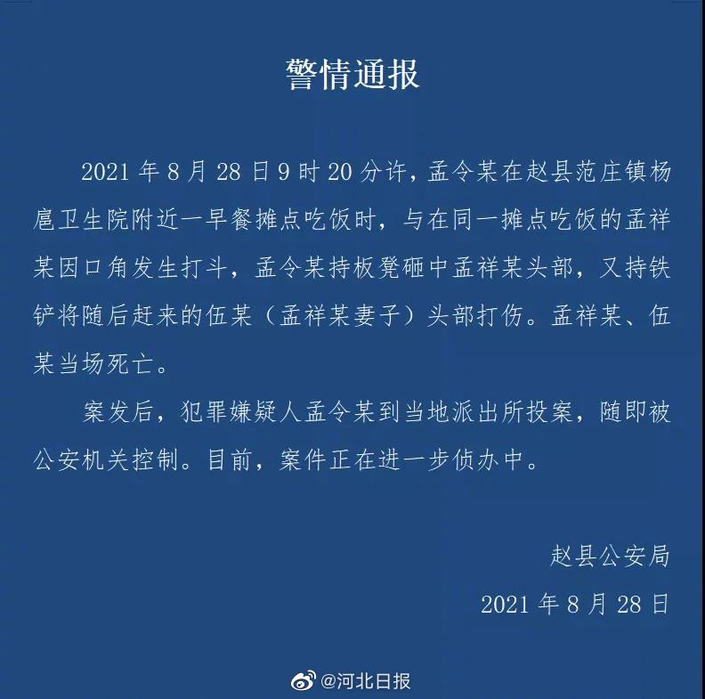 8月28日,河北石家庄市赵县公安局发布警情通报:2021年8月28日9时20分许,孟令某在赵县范庄镇杨扈卫生院附近一早餐摊点吃饭时,与在同一摊点吃饭的孟祥某因口角发生打斗,孟令某持板凳砸中孟祥某头部,又持铁铲将随后赶来的伍某(孟祥某妻子)头部打伤。孟祥某、伍某当场死亡。