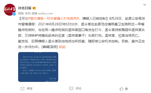 河北警方通报一对夫妻遭人打伤致死:嫌疑人已被控制