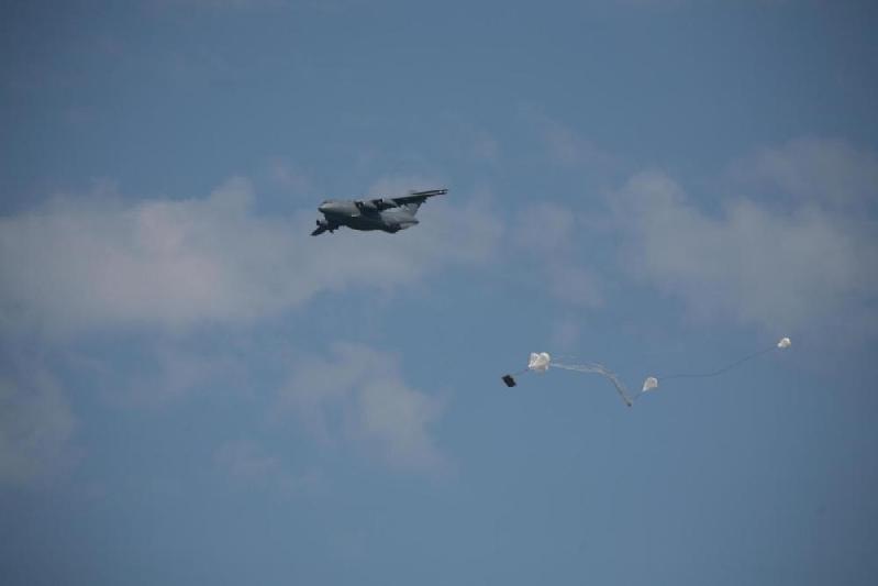 当地时间13时11分,靶场上空,一架运-20呼啸而至,后舱门徐徐打开,牵引伞和主伞先后飞出,紧接着重装平台滑出机舱、向下急坠,几秒钟后,3朵巨大的白色伞花灿然绽放,数十秒后平台在靶标附近接地。