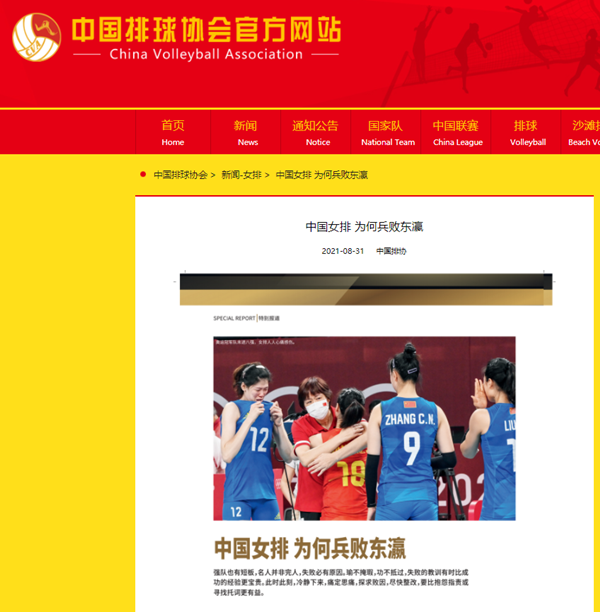 图说:中国排协官网转载的《中国女排 为何兵败东瀛》一文