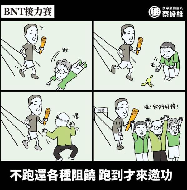 蔡峻维在脸书发布漫画讽刺这才是“民进党的BNT接力赛”。