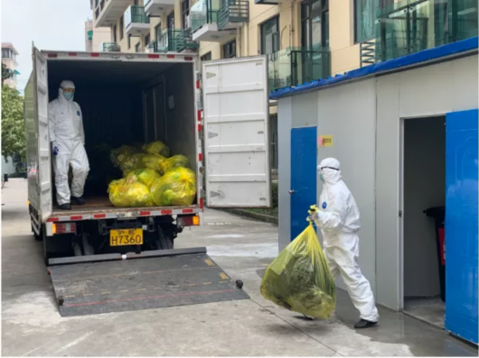 自本市对各隔离点产生的生活垃圾实施专项收运处理后,虹口率先将隔离点生活垃圾纳入小型医疗机构医废收运工作统一管理。每天有1辆大型收运车将区内2个集中隔离观察点及居家隔离观察人员产生的生活垃圾运送到集中转运点,再与市固处公司车对车交接,尽快进行无害化处置。
