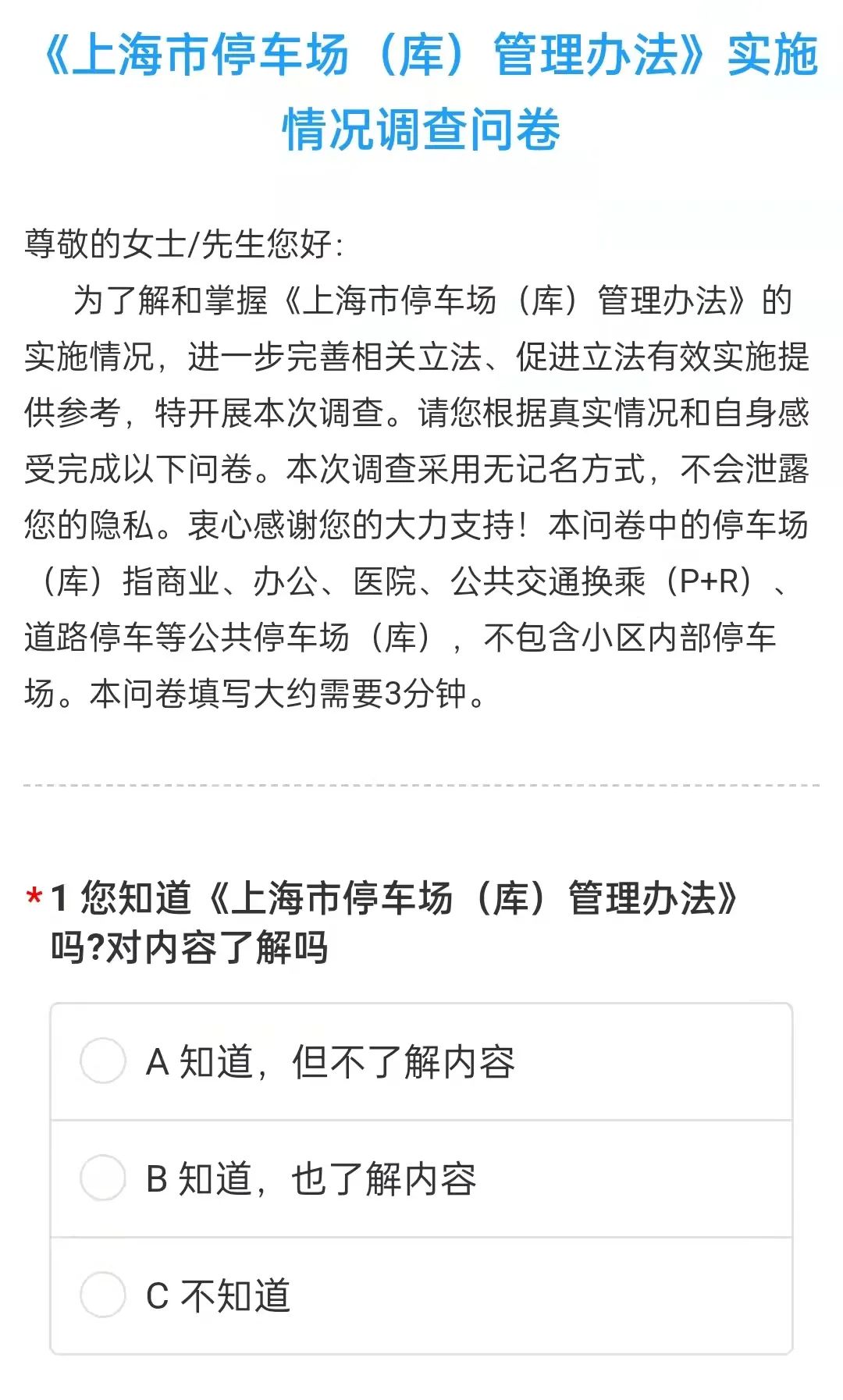 市交通委说,为做好《上海市停车场(库)管理办法》的后评估工作,现对实施情况开展调查问卷。本次问卷涉及了停车的需求、停车中遇到的困难、对停车场(库)管理的建议等多方面。点击微信文末左下角“阅读原文”即可填写问卷。