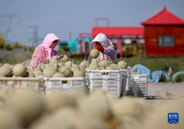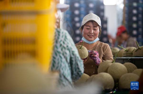 9月8日,农民在宁夏灵武市郝家桥镇泾灵新村蜜瓜种植基地分拣、包装蜜瓜。