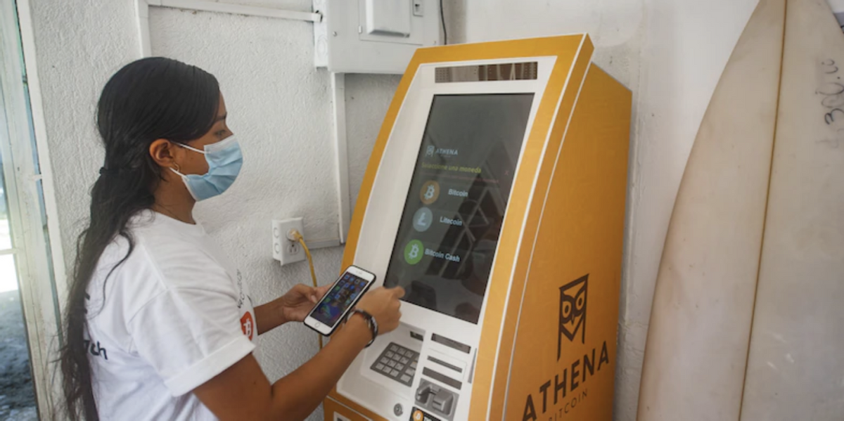 (图说:一位女子在萨尔瓦多的比特币ATM机上取款)