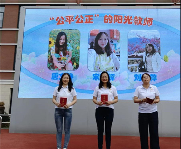 工会主席张剑萍老师宣读了“公平公正的阳光教师”的颁奖词,并为获得该荣誉的唐文静老师、宋延辉老师、刘海萍老师颁发了荣誉证书。