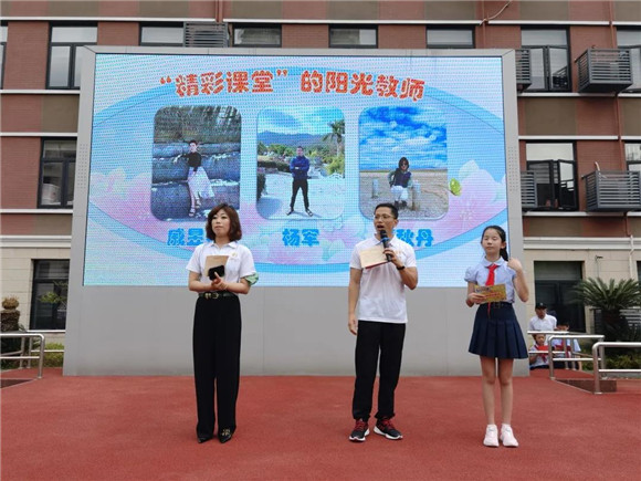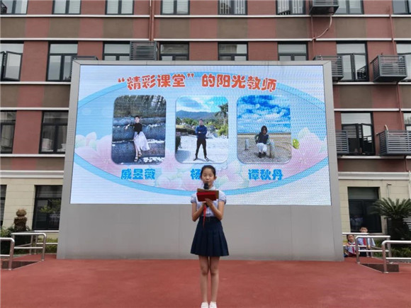 大队委员杨璐琳宣读了“上课精彩的阳光教师”——戚昱薇老师、谭秋丹老师和杨军老师的颁奖词,并为获奖老师颁发了荣誉证书。