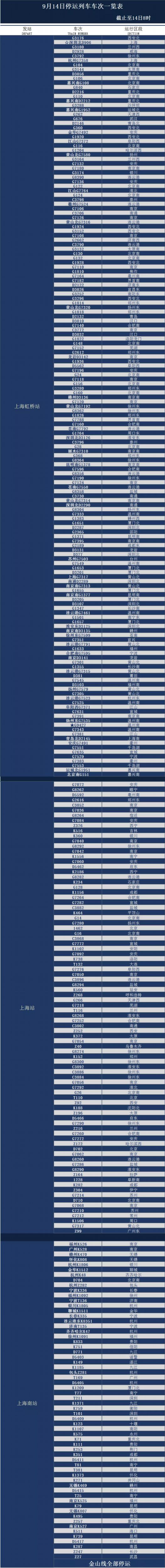 铁路上海站说,截至9月14日8时,受台风影响仍有停运列车352列,其中上海站88列,上海南站99列,上海虹桥站165列。详见: