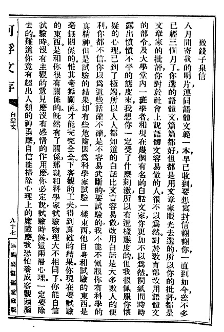 不过,相似的地方经历,不一定会导出类同的见解。钱基博早年在乡也参与组织过“理科研究会”,对自然科学有过自行研究,但他更视“文”本身足以成“学”。他不否认表达思想学理这一功能的重要性,但不认为这是“文”之改革唯一的关键面向。收到裘廷梁的批评后,他在复信中强调他不至于如一些“国粹派”老先生一样一味保守,可也不会如裘氏一样“迷信”白话文,如同在轮船造好之前不应舍弃帆船,在白话文真正完善起来之前,他不会赞成废弃文言之论。