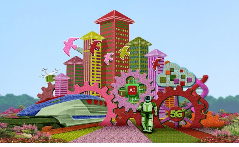 东单东南角将打造“高质量发展”主题花坛,花坛顶高9米,以蓬勃发展的社会主义现代化建设为场景(世界首套设计时速达600公里的高速磁悬浮列车、城市建设、人工智能、5G、芯片、区块链技术等),展现我国把握新发展阶段,贯彻新发展理念,加快构建新发展格局,推动“十四五”时期高质量发展,确保全面建设社会主义现代化国家开好局、起好步。