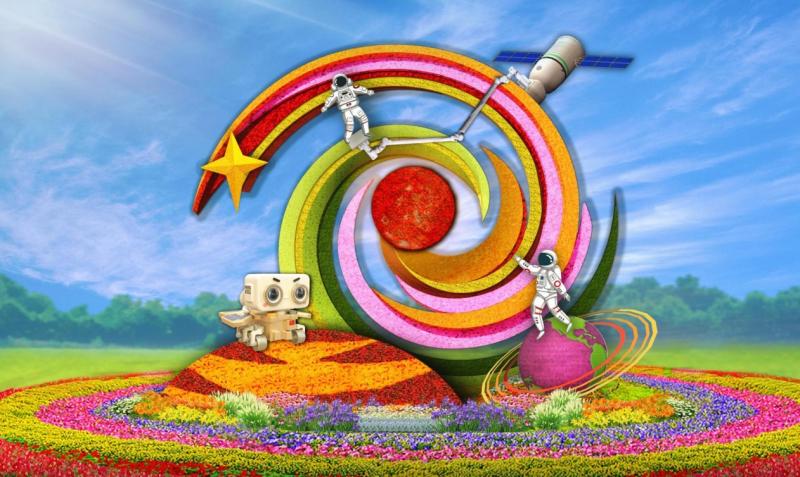 东单西北角花坛以“创新引领”为主题,花坛顶高8.5米,以中国宇航员探索太空奥秘为主景,配以空间站、“祝融号”火星车、机械臂等,生动展示通过科技自立自强,实现国家强盛。