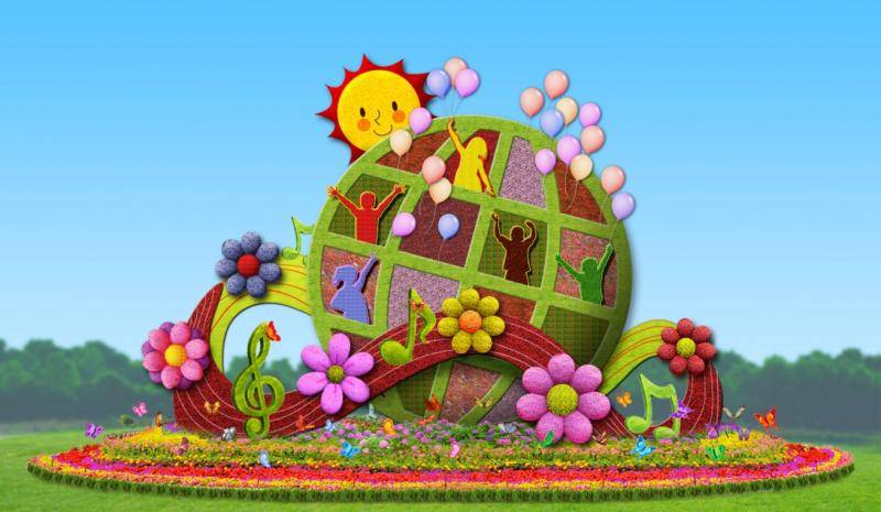 东单西南角布置“命运共同体”主题花坛,花坛顶高8.5米,以地球为主景,配以放飞气球的儿童、友谊的飘带、花朵、音符等,体现出了我们将高举和平、发展、合作、共赢旗帜,同世界各国人民深化友谊、加强交流,推动构建人类命运共同体。