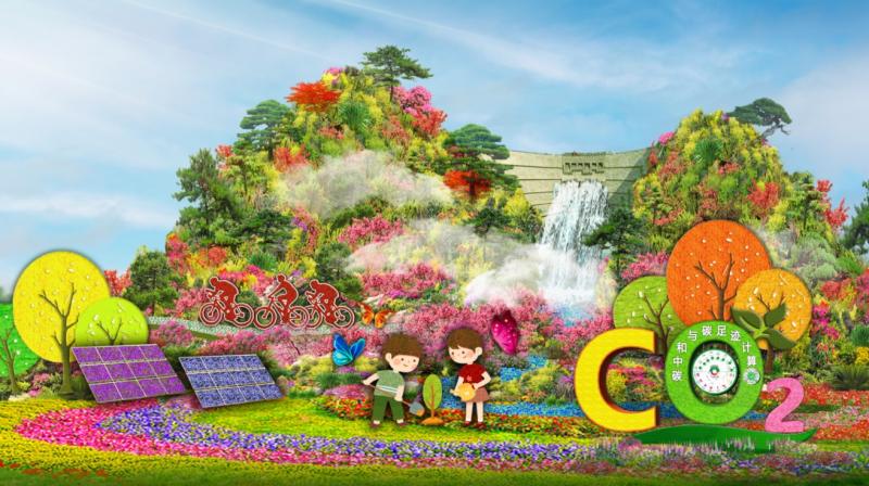 西单东南角主题花坛为“绿色发展”,花坛顶高9.5米,通过百花齐放春满园的场景,配以白鹤滩水电站、太阳能板、骑行的人、植树的儿童、碳中和计算互动装置等,展示出通过提升林业碳汇,助力实现碳中和,同时展望绿色发展的美好明天。