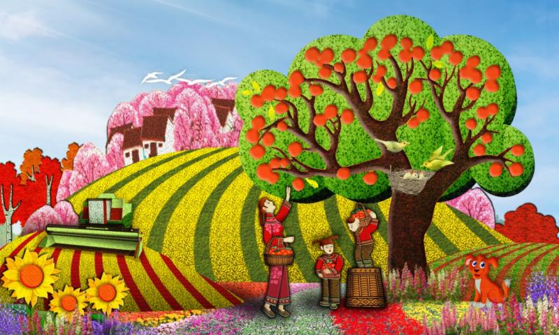西单西北角布置“乡村振兴”主题花坛,花坛顶高8.5米,以秋季的丰收景象为主景,展现出产业兴旺、生态宜居、乡风文明、治理有效、生活富裕的中国特色社会主义乡村振兴新篇章。