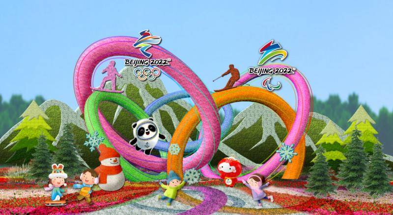 西单西南角花坛以“喜迎冬奥”为主题,花坛顶高8.5米,以喜迎冬奥的冰天雪地为主景,通过发展全民健身运动,努力建设健康中国,弘扬奥运精神,展示中国魅力。