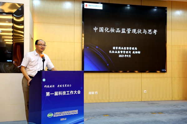 图二:国家药品监督管理局化妆品司副司长戚柳彬作题为《中国化妆品监管现状与思考》的报告。