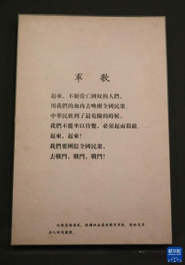 在东北抗日义勇军纪念馆拍摄的《义勇军誓词歌》歌词(7月21日摄)。