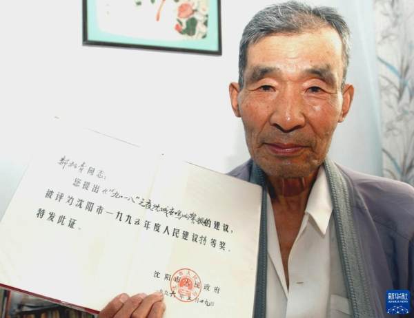 沈阳市民郝松青在展示自己“9月18日鸣响警报的建议”获得当年人民建议特等奖证书(2005年9月13日摄)。