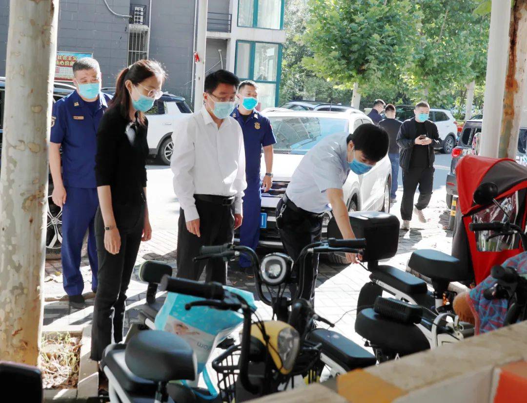 区委书记高朋到阳光水岸小区查看高层建筑电动自行车智能阻车系统安装、运行,社区公共充电车棚、充电桩建设以及电动自行车存放、充电等消防安全工作落实情况。