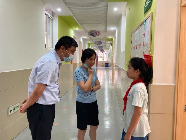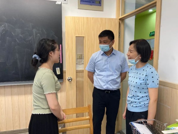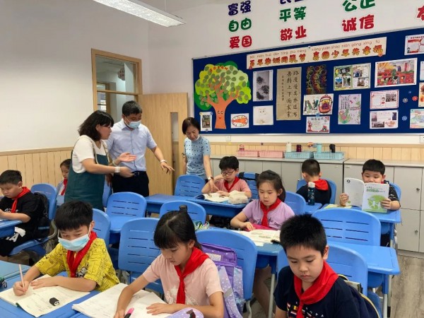 9月8日学生离校时分, 徐汇区教育局王彤局长来到学校,实地关心和指导学校课后服务落实情况。陈静校长详细介绍了学校的实施过程,对今后工作的开展也展开了设想。