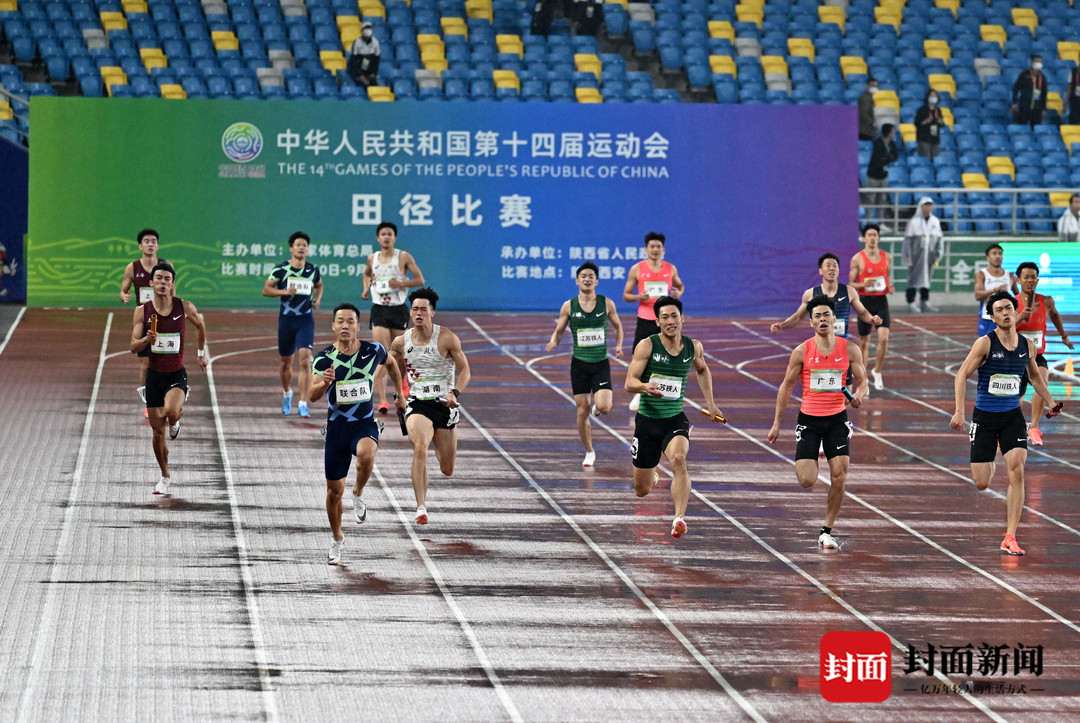 在晚些时候进行的男子4X100米接力决赛中,由奥运接力成员汤星强、谢震业、苏炳添和吴智强组成的联合队出战。决赛,联合队在第八道,出发后第一棒,200米冠军汤星强冲了出去,江苏队也不甘示弱,第二棒谢震业直道出击,联合队稍稍占优,第三棒苏炳添弯道加速成功交接,最后一棒吴智强强力冲刺,力压江苏队的石雨豪,联合队率先到达终点,跑出38秒50的成绩夺冠。江苏队38秒67获得亚军,四川队38秒83第三,再度捍卫了四川田径在短跑上的优势。