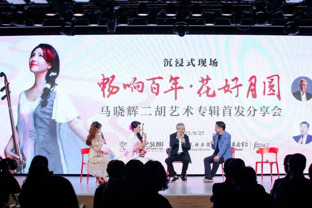 东方网9月27日消息:身着由画家陈家泠手绘的一身白衣,二胡表演艺术家马晓辉手持二胡站立演奏《万马奔腾》,音乐随着画作飘逸流动。9月27日,“沉浸式现场:畅响百年·花好月圆——马晓辉二胡艺术专辑首发分享会”在上海广播艺术中心举行。