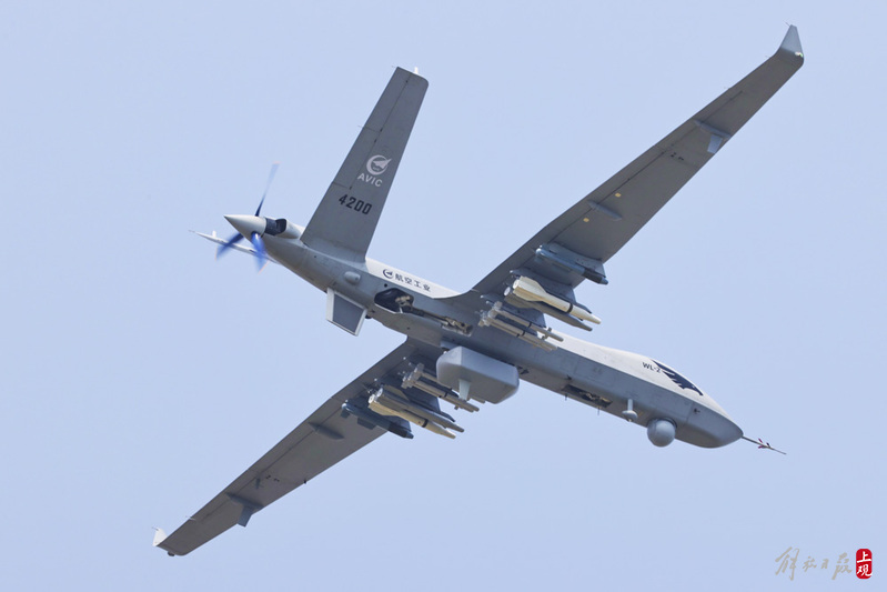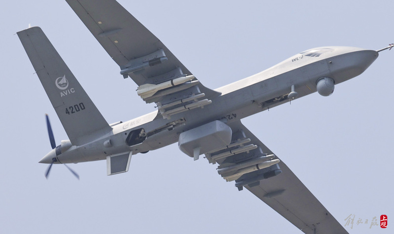 “翼龙2”无人机挂弹表演。