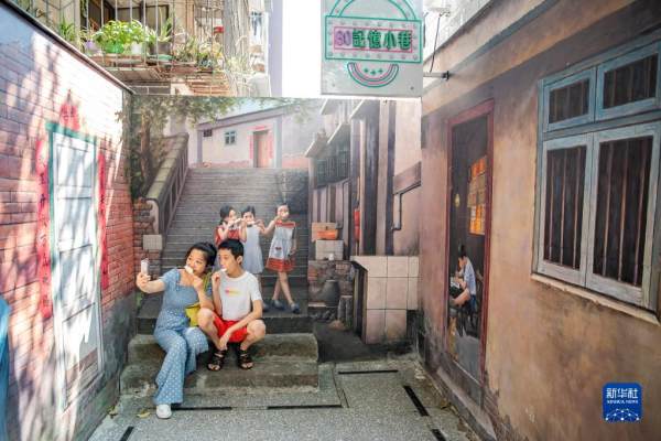 10月5日,游客在重庆市南岸区南坪街道正街社区“超级80街”的80记忆小巷拍照。