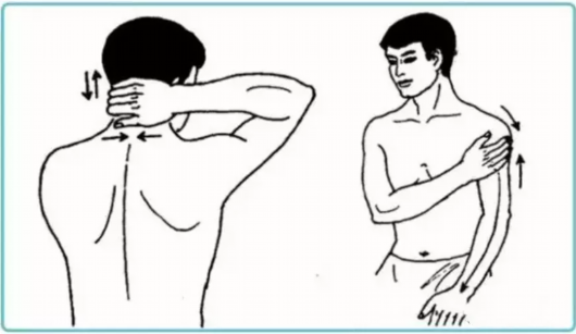 操作:两手五指在颈后交叉相握,抱于后颈部,头稍向后仰,用掌指和掌根挤提颈部肌肉。