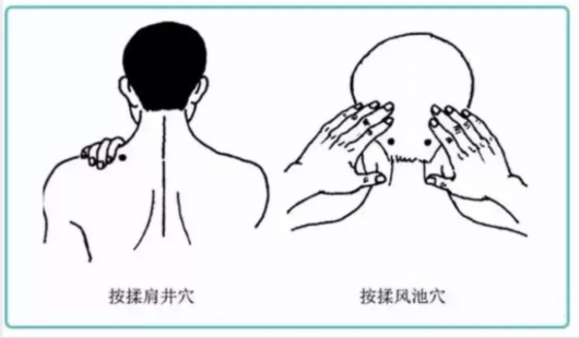 操作:肩井穴位于第7颈椎棘突与肩峰最外侧点连线的中点。以一手中指端着力,反复按揉穴位约2分钟,以局部感酸胀为宜。按揉风池穴,两手拇指端着力,颈后枕骨粗隆下方凹陷处风池穴,由轻渐重,反复按揉约2分钟。