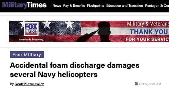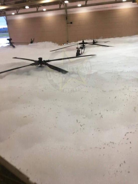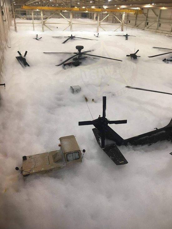 比如2014年,俄克拉荷马州塔尔萨国民警卫队的机库也曾发生过类似的意外事故,6架“黑鹰”直升机被消防泡沫淹没。
