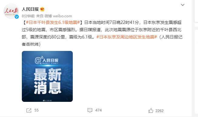 日本当地时间7日晚22时41分,日本东京发生震感超过5级的地震,市区震感强烈。据日媒报道,此次地震震源位于东京附近的千叶县西北部,震源深度约80公里,震级为6.1级。