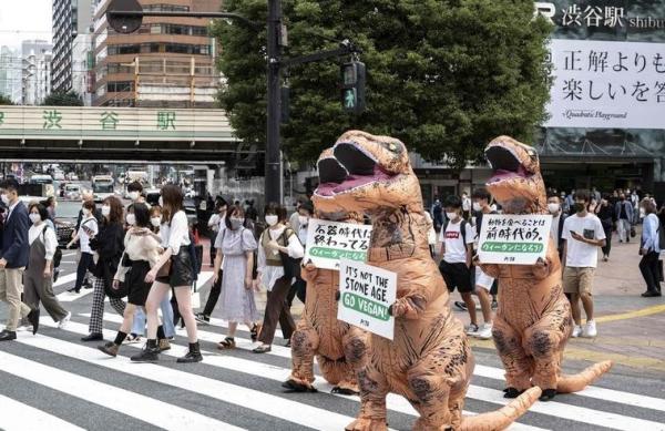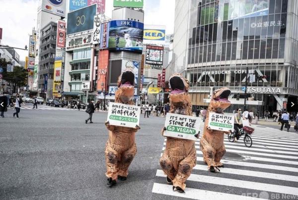 “善待动物组织”街头呼吁“吃素”,日网友:那干嘛扮成食肉恐龙……