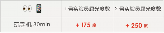 通过测量不同活动后的眼睛屈光度,可以得出眼疲劳情况。实验人员在玩了30分钟手机后,屈光度分别加深了175度和250度。