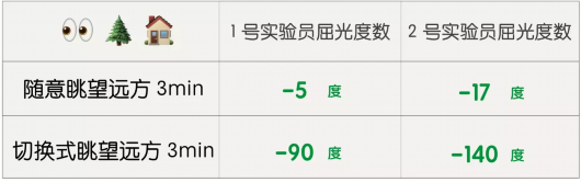 经过3分钟自由的眺望远方后,实验员双眼视力则分别平均恢复5度和17度。两次屈光度变化不大,说明睫状肌并没有得到充分的放松。