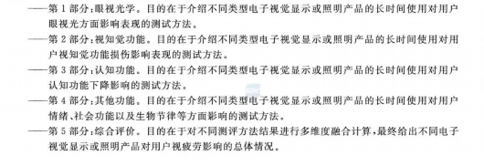 根据不同类型电子视觉显示终端产品以及LED等照明产品对用户视疲劳的影响情况,GB/T 40230系列标准将视疲劳测试划分为眼视光学、视知觉功能、认知功能以及其他功能四大方面进行,最后基于不同测评方面的结果得出综合评价。目前已发布了第1部分和第2部分。