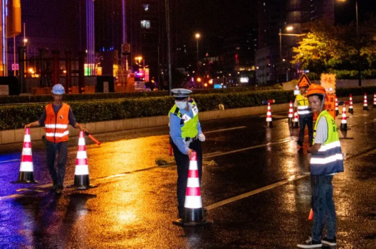 项目位于徐家汇中央活动区的五岔路口,承载着内环高架及延安高架的过境车流,天桥横跨漕溪北路及虹桥路两条主干道,地面下方有衡山路地道,轨交1、9、11号线,周边商业体集聚,人流密集,吊装施工处于国庆及进博前后,施工难度较大。9月28日经与市交警总队协商,得到了市交警总队的大力支持,排定了施工交通组织方案。