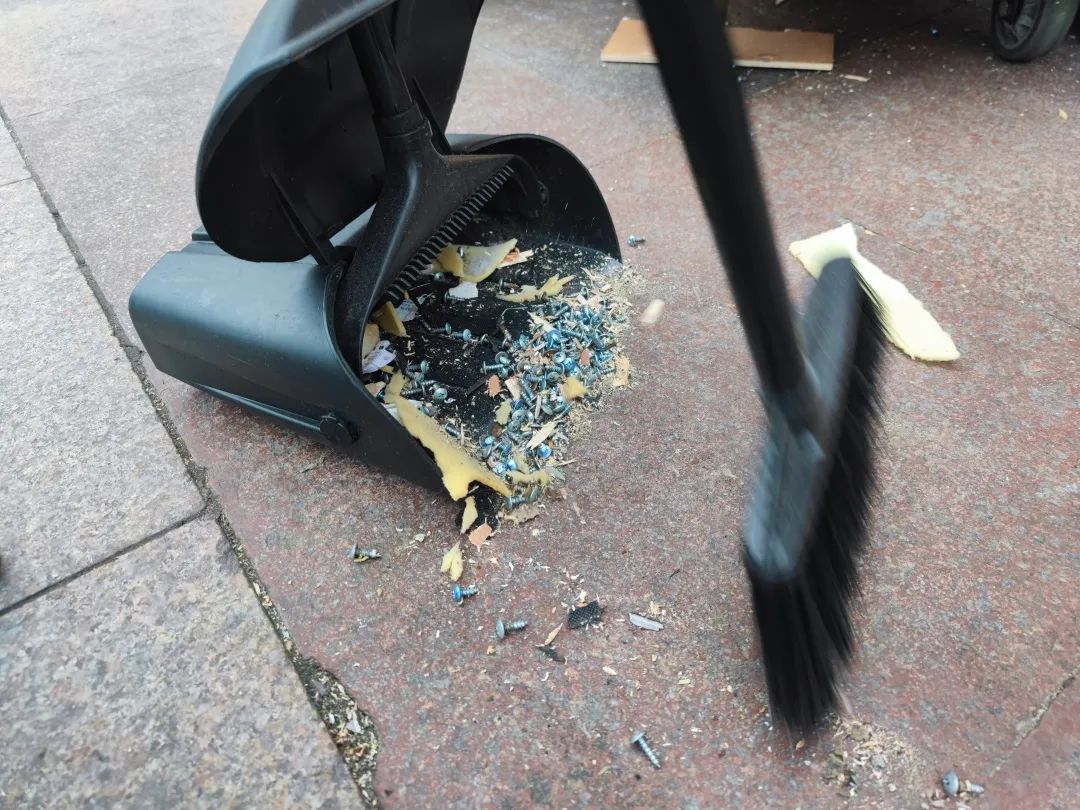 城管执法人员来到现场,果然发现了一堆杂物,经与附近店铺核实得知,这堆东西是一个餐厅从椅子上扒下来的旧坐垫,因为有螺钉固定,所以现场会有一些散落的钉子,因为东西比较多就临时堆在了门口,没承想会扎到行人。