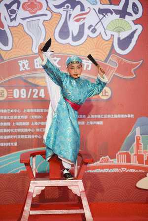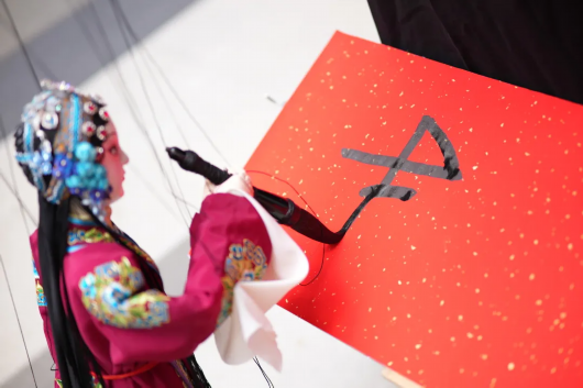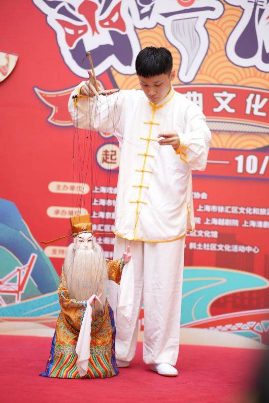 上海戏剧学院学生带来“戏曲有戏青春有我”戏曲快闪,不仅表演了《游街》《武家坡》《赤桑镇》3个京剧选段,打戏、文戏令人拍案叫绝,更将木偶戏与京剧相融合,演员们走下台和大小朋友们近距离互动,小木偶表演了变脸、书法等,栩栩如生、生动细致的表演收获了现场阵阵掌声。