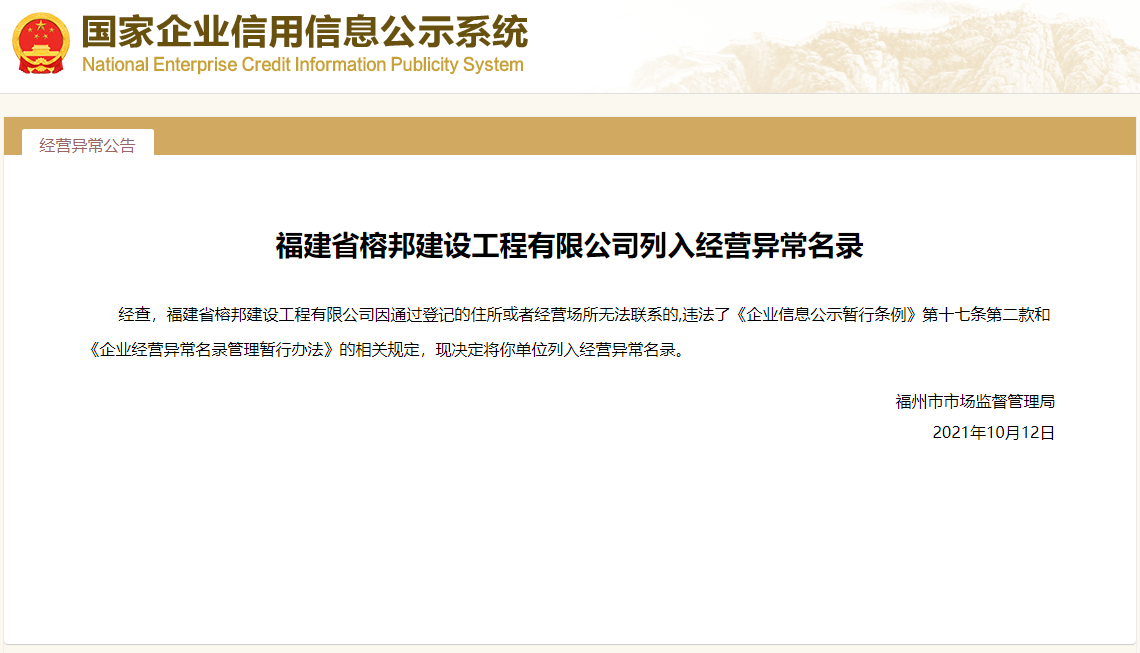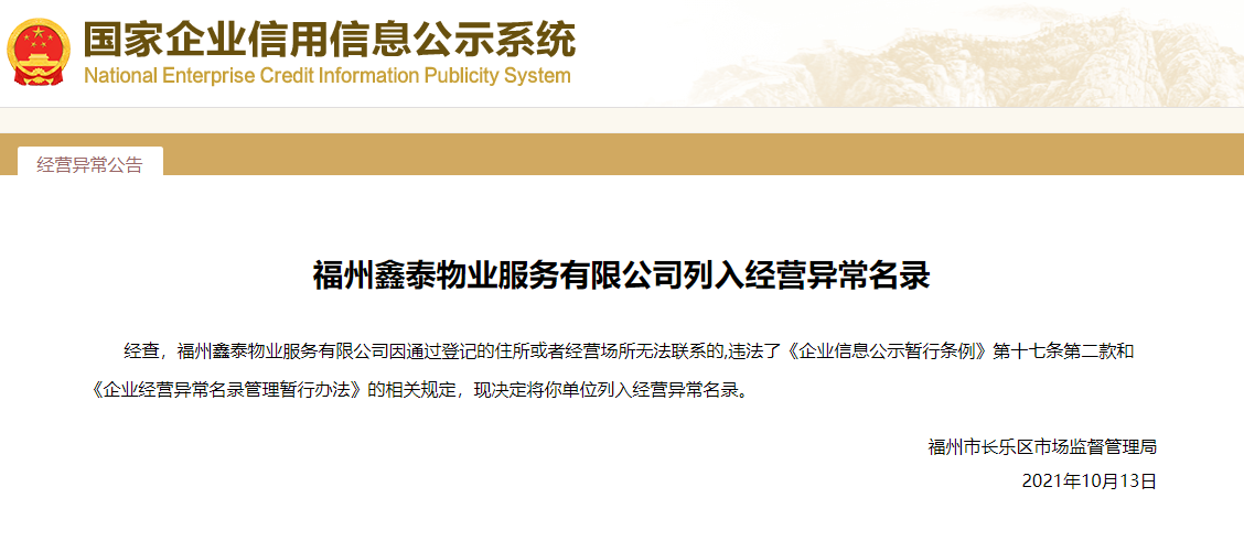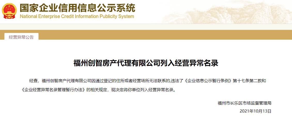 登记场所无法联系 福建多家房地产相关企业被列入经营异常名录!