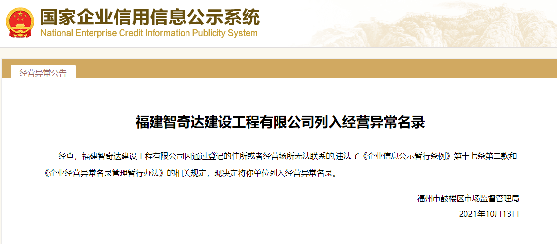 中国质量新闻网讯(顾爱龙)10月13日,福建省多地市场监督部门发布了经营异常名录公告,其中包括建设建筑工程公司、物业公司及房地产代理公司,均因登记的住所或者经营场所无法联系,违反了《企业信息公示暂行条例》第十七条第二款和《企业经营异常名录管理暂行办法》的相关规定,被列入经营异常名录。