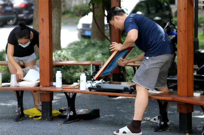 在菊园,“转角遇到美”的案例俯拾皆是。比如,嘉华居小区将生活空间与公共艺术空间“折叠”,在提升社区品质的同时,也让居民得到了美的享受。邱皓是一名画家,今年8月在嘉华居小区定居,最近有了个新爱好:在小区广场上创作版画。“我刚到这个小区就发现了这块很棒的社区场地,它的点线面构成和色彩搭配非常契合我的设计灵感!”邱皓十分享受这种充满了艺术想象的生活空间,他认为,这块场地也能提升社区居民的美学素养。