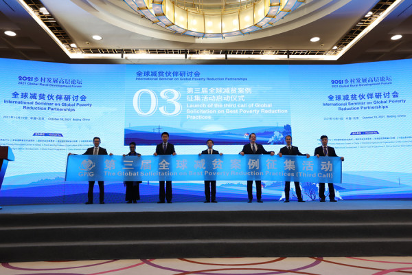 10月19日,“2021乡村发展高层论坛平行论坛1:2021全球减贫伙伴研讨会”在北京举行。图为第三届全球减贫案例征集活动启动。中国网 郑亮/摄