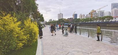 苏州河步道中远两湾城段总长约1.6公里,记者17日中午从中潭路地铁站出来后,穿过小区到达步道,自西向东步行。沿途花坛错落有致,水面上不时有水鸟掠过,因为背靠居民小区,即使周末大幅降温,沿河散步的市民仍不少。