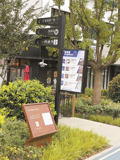 另一个明显感受是,垃圾箱增多了,几乎每隔十几米,就有一组“干垃圾”和“可回收垃圾”垃圾箱。再往前走,垃圾箱渐渐变少了,厕所依然没有找到,一直走到小花园湾,终于看到了“洗手间”标识和“创享塔广场”“一网通办”等指示标在一块指示牌上。原来,洗手间就在创享塔创意园内。这一段的苏州河步道与创享塔园区是打通的。