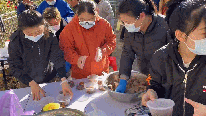 广场东侧,工作人员、志愿者们分工明确,有的精心熬制米粥,有的负责煮藕,有的分装咸菜,有的准备窝头,忙得不亦乐乎。忙活的间隙互相调侃几句,邻里间的烟火气在这里体现得淋漓尽致。